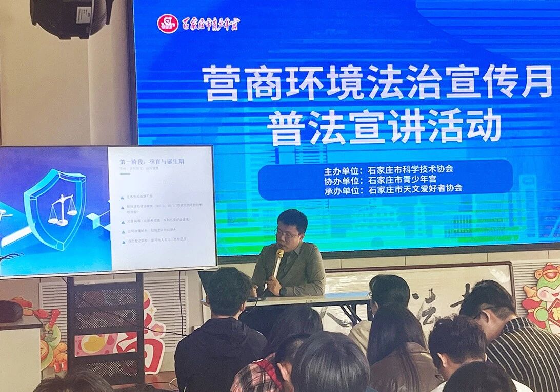 为进一步优化营商环境,提升企业依法经营和风险防范能力,9月27日,由石家庄市科协主办的“营商环境法治宣传月普法宣讲活动”在市青少年宫举行。此次活动邀请了市中小企业发展促进会、市衡水商会、市消防器材行业协会、市民政局社会组织孵化中心、市社会心理学会、河北地质大学、市青少年宫、市天文爱好者协会、河北欣诺科技有限公司、欣诚信息技术有限公司、石家庄深空天文设备科技有限公司、河北福慧教育咨询有限公司、新华区追星文化艺术交流中心等多家单位代表参加。通过法律知识宣讲和案例分析,帮助企业解决经营过程中遇到的实际问题,营造良好的法治化营商环境。