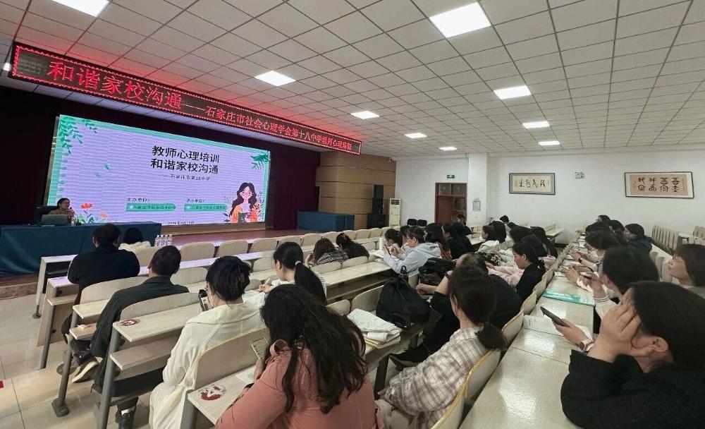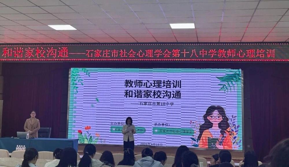 4月15日,石家庄市社会心理学会依托科技工作者之家平台,为石家庄市第十八中学的70余名教师带来了教育心理学科普讲座。本次讲座由石家庄市社会心理学会副会长郝志英担任主讲,旨在提高教师群体的心理健康素养以及家校沟通实践能力,助力教师群体妥善应对教学压力、学生管理、家校沟通等多方面的挑战。