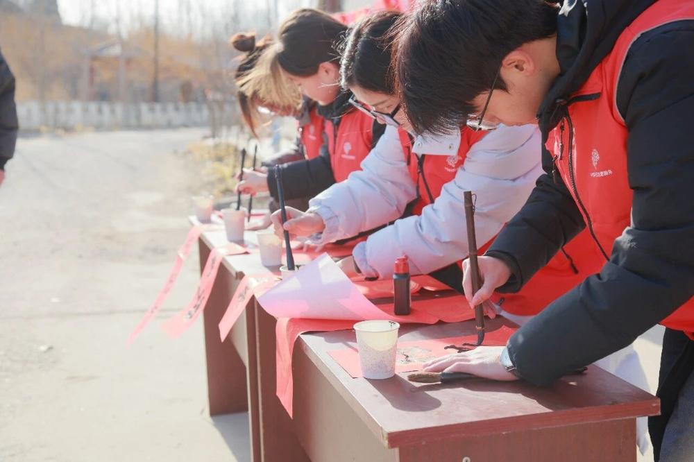 在慰问调研环节,志愿者们分组入户走访,与群众亲切交谈,细致询问身体状况、生活难题及实际需求,并送上慰问物资,以真挚的关怀带去冬日暖意与新春祝福。同时,书法文化进乡村的活动现场更是墨香四溢、氛围热烈。志愿者们挥毫泼墨,一副副吉祥的春联、一个个饱满喜庆的“福”字接连呈现,村民们热情参与、争相领取,现场洋溢着浓浓的新春气息。