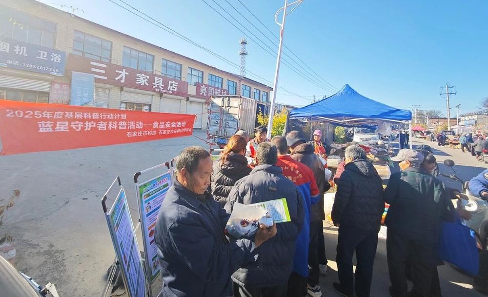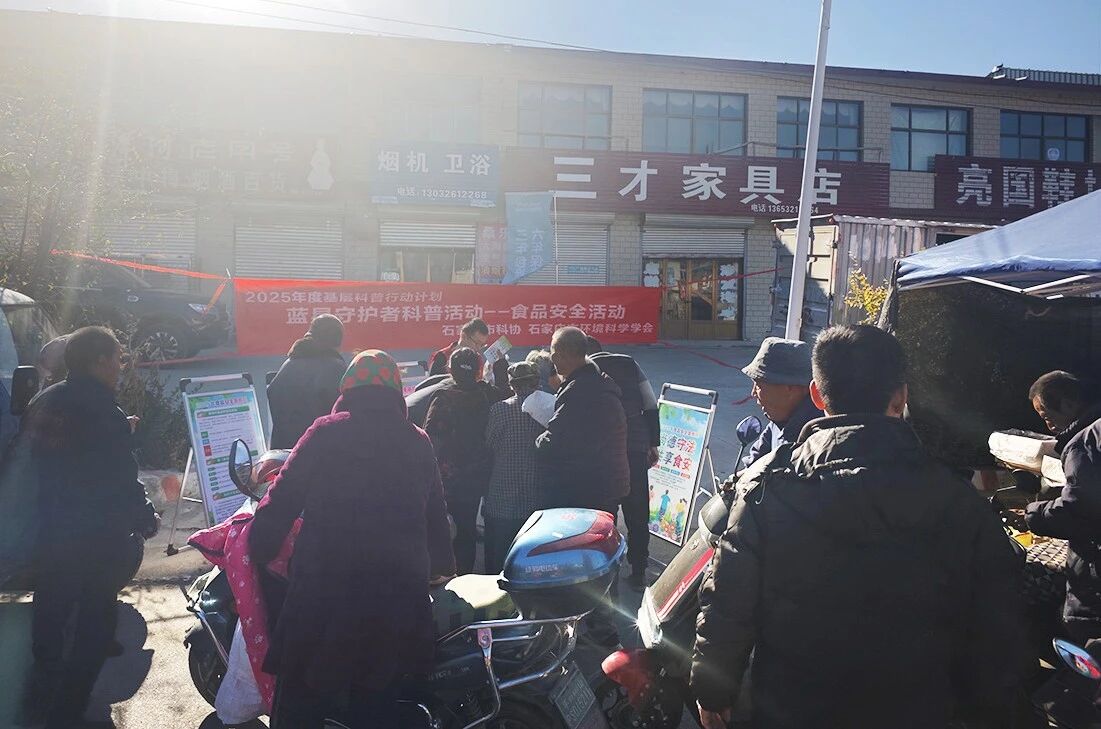 11月21日,石家庄市环境科学学会科技工作者走进平山县下槐镇大集,向赶集的村民宣传食品安全知识,发放科普手册。
