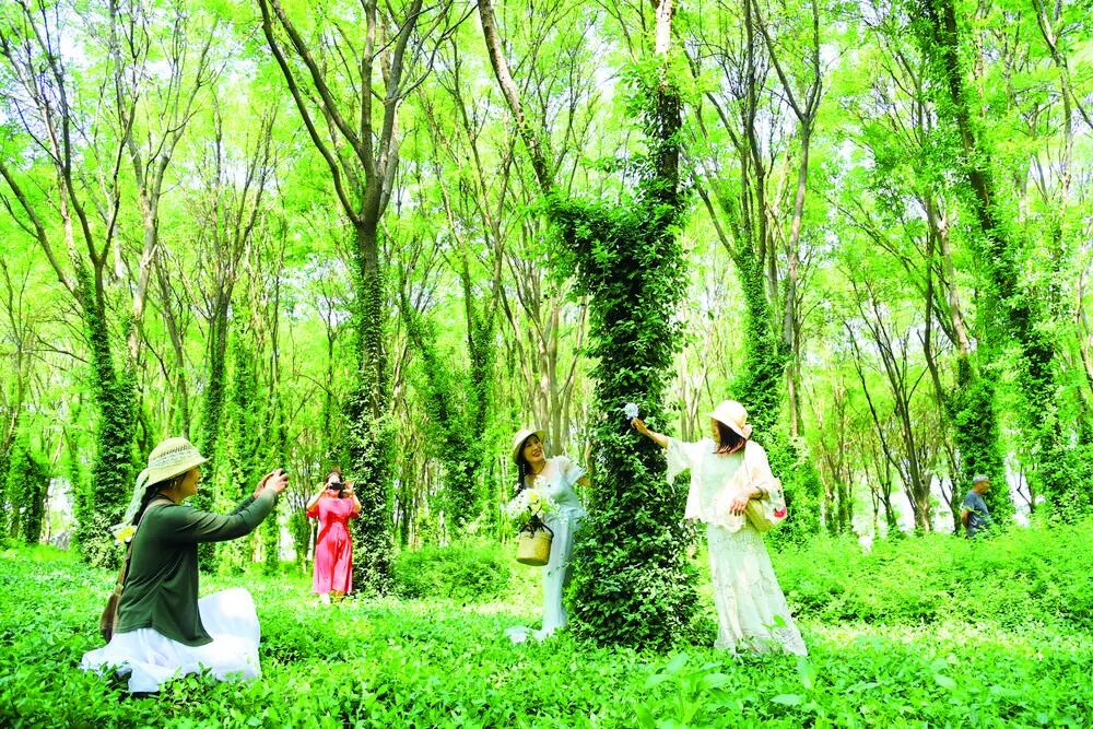 在石家庄市石津灌渠文化公园小叶扶芳藤树林,市民在游玩拍照。