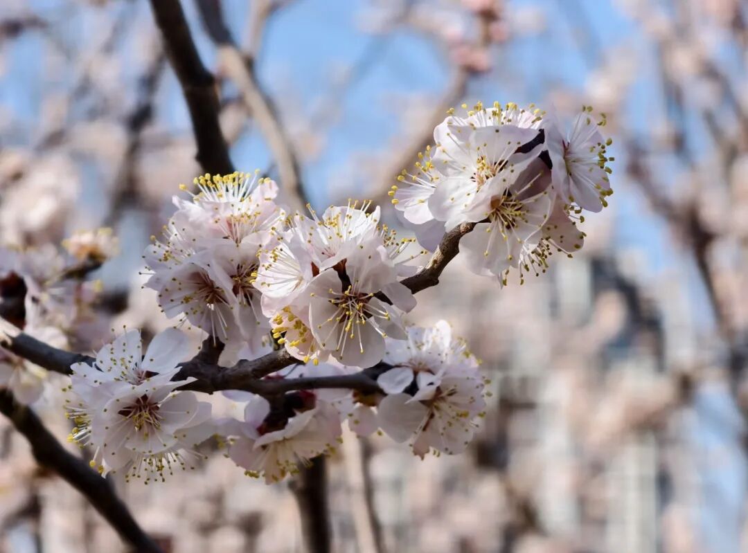 石津灌渠文化公园的大草坪旁,层层叠叠的粉白花团与茵茵绿草相映成趣,市民游客纷纷举起手机,定格这限定的春日美景。民心河北线友谊大街至党家庄街路段,沿河北岸30余株杏花竞相绽放,白中透粉,繁花满枝,与澄澈的河水、吐露新芽的垂柳共同描绘出一幅清新雅致的水岸画卷。