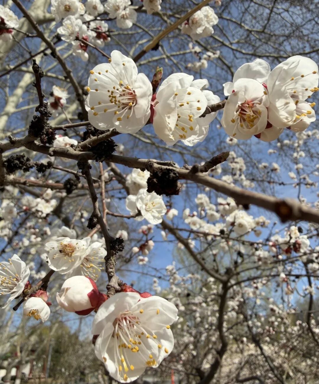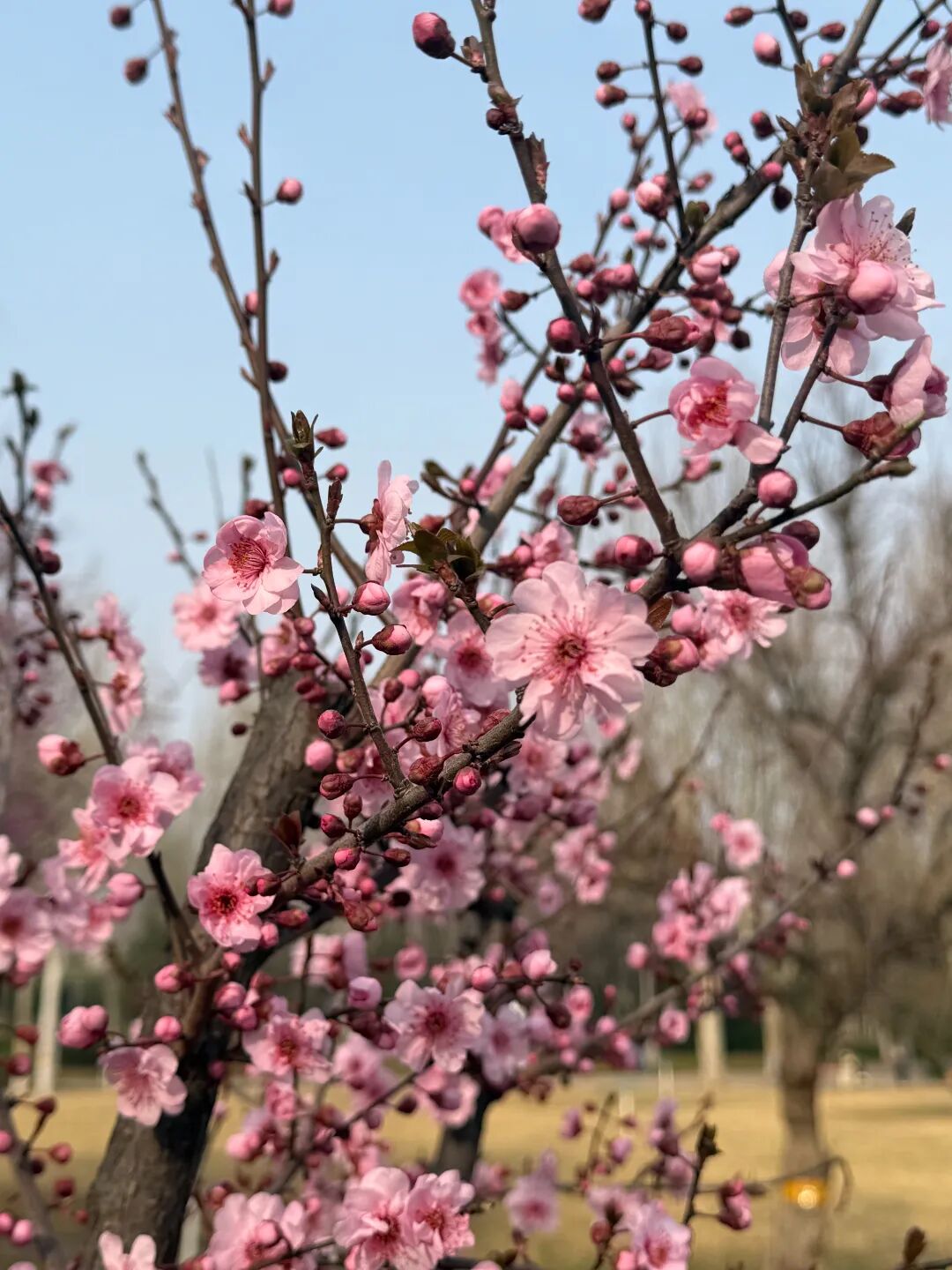 在裕西公园东主路,一树树美人梅摇曳生姿,远远望去如绯红色云霞,亮丽夺目,引得众多市民前来拍照留影。在中央绿色体育公园B区西侧与C区东侧栽植有数十株美人梅,春日暖阳下,花枝舒展盛放,花朵粉嫩明艳,缀满枝头。