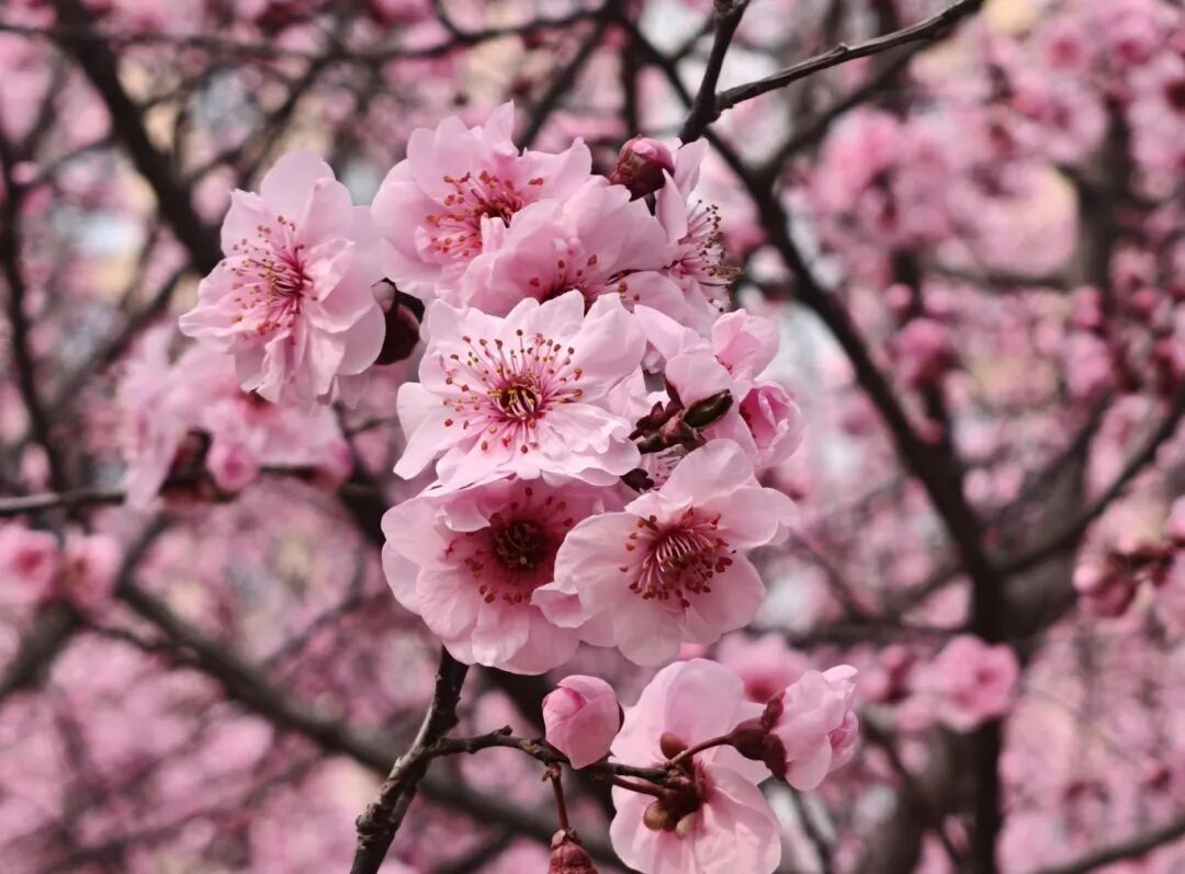 翠屏湿地公园内,60株美人梅次第盛放,勾勒出别样的春日风景线。南区门口,花枝簇拥、粉艳动人,宛如迎宾花廊,春意盎然;小河北岸,美人梅临水而开,花影浮动,相映成趣,微风拂过,花瓣轻轻飘落,市民置身其中,尽赏临水赏花的雅致意境。