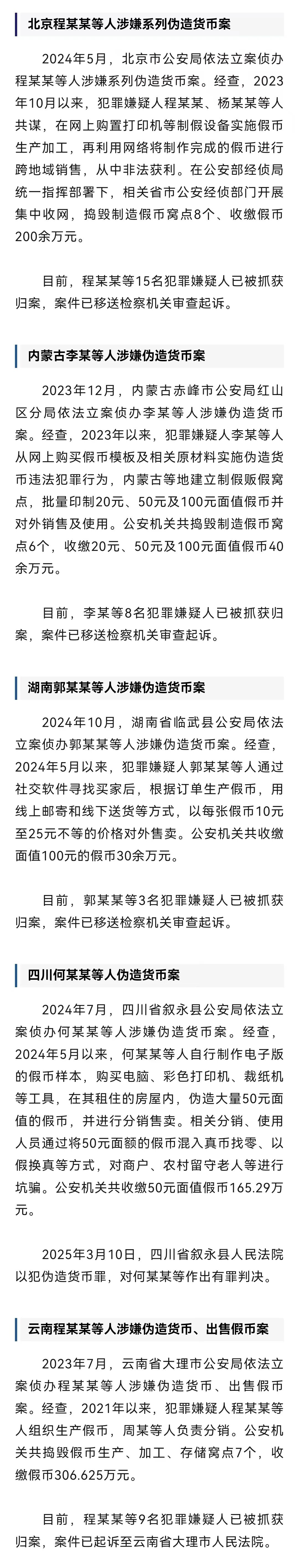 1.伪造货币案,多人被抓获:假币严重危害国家金融管理秩序和人民群众财产权利。近年来,公安机关坚持依法严厉打击假币犯罪活动,坚决遏制假币犯罪滋生蔓延,特别是针对订单式小规模生产的打印类假币犯罪活动,坚持主动担当作为,深挖犯罪线索,持续加大打击力度,成功侦破一批典型案件,有力维护了国家货币安全和人民群众合法权益。(公安部)