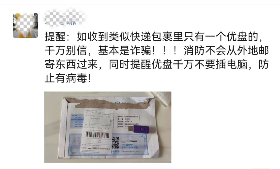4.“李鬼”快递拆出U盘,居民看清后秒报警:近日,浙江省杭州市淳安县有居民收到不明来源的快递包裹,快递单上显示发件人是“消防****”,并标明“2025秋季消防整顿通知”。快递单上的文字让居民不敢耽搁,拆开后发现里面仅有一个U盘。好在居民防范意识强,立即联系公安部门核实。经核实,这是诈骗!(浙江消防)