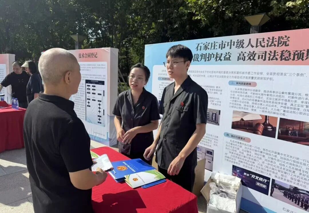 2. 石家庄中院参加优化营商环境集中宣传活动:近日,石家庄中院干警前往世纪公园世纪广场,参加由市营商办主办,市检察院、市司法局等30余家单位参与的优化营商环境集中宣传活动。活动现场,干警们采取设立咨询台、发放宣传资料等人民群众喜闻乐见的方式,宣传解读《中华人民共和国民营经济促进法》《石家庄市优化营商环境条例》等相关法律法规及惠企惠民政策,向驻足群众发放《企业常见法律风险提示手册》,面对面解答群众提出的关于诉讼流程、中介合同、买卖合同等方面的法律问题,并特别介绍了石家庄法院在优化营商环境工作中的主要做法及工作成效。(石家庄中院)