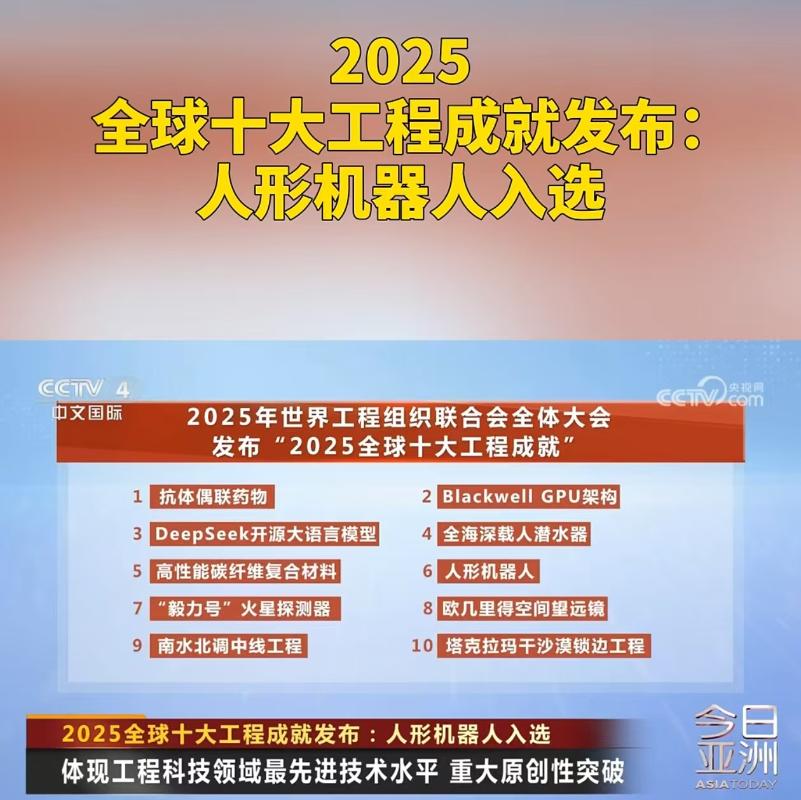 3.2025全球十大工程成就发布!中国科技惊艳世界:在2025年世界工程组织联合会全体大会开幕式上,正式揭晓“2025全球十大工程成就”,从DeepSeek开源大语言模型到人形机器人,来自中国的工程科技成果为应对全球性挑战发挥着关键作用。(CCTV4)