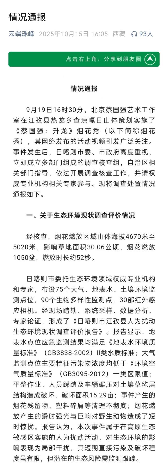 1.蔡国强烟花秀,调查处置情况通报!针对日前蔡国强烟花秀引发广泛关注,“云端珠峰”微信公众号15日发布情况通报↓(新华社、云端珠峰微信公众号)
