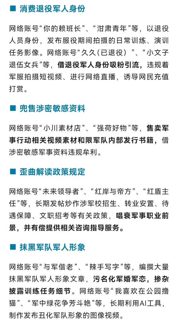 3.违规发布涉军信息,一批自媒体账号被处置:近期,一些自媒体账号违反《互联网军事信息传播管理办法》,违规发布涉军信息,误导公众认知,损害军队形象,社会影响恶劣。军地职能部门依法依规处置了一批网上违法违规信息及自媒体账号,有关典型案例如下↓(新闻联播)
