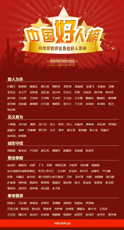 1.揭晓!2025年第三次“中国好人榜”榜单:2025年第三次“中国好人榜”发布仪式暨全国道德模范与身边好人现场交流活动10月15日在新疆维吾尔自治区阿克苏地区举办。经各地推荐、网民评议和专家评审等环节,共有138名助人为乐、见义勇为、诚实守信、敬业奉献、孝老爱亲身边好人光荣上榜。(人民网)