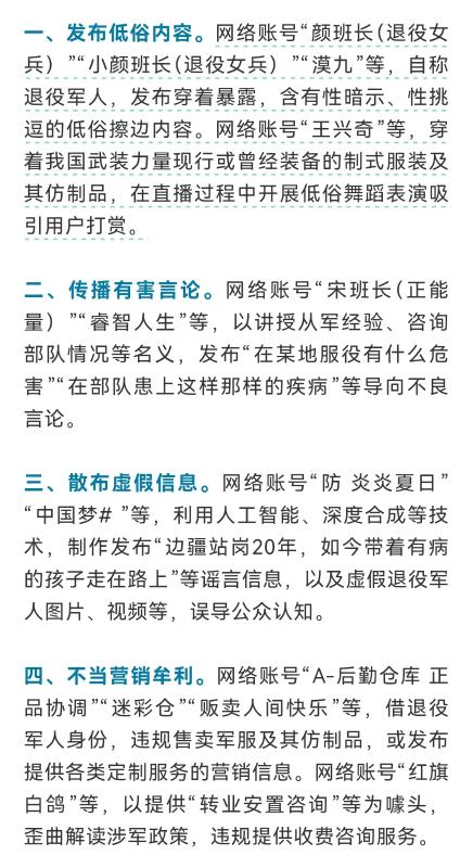 1.“颜班长(退役女兵)”等账号,被处置:根据“网上涉退役军人不当行为和有害信息内容专项整治”工作安排,近期,国家网信办指导各网站平台从严整治以退役军人名义售卖假冒伪劣商品、进行低俗表演、消费军旅情怀、损害退役军人形象等问题,处置一批违法违规账号。现将部分典型案例通报如下↓(“网信中国”微信公众号)