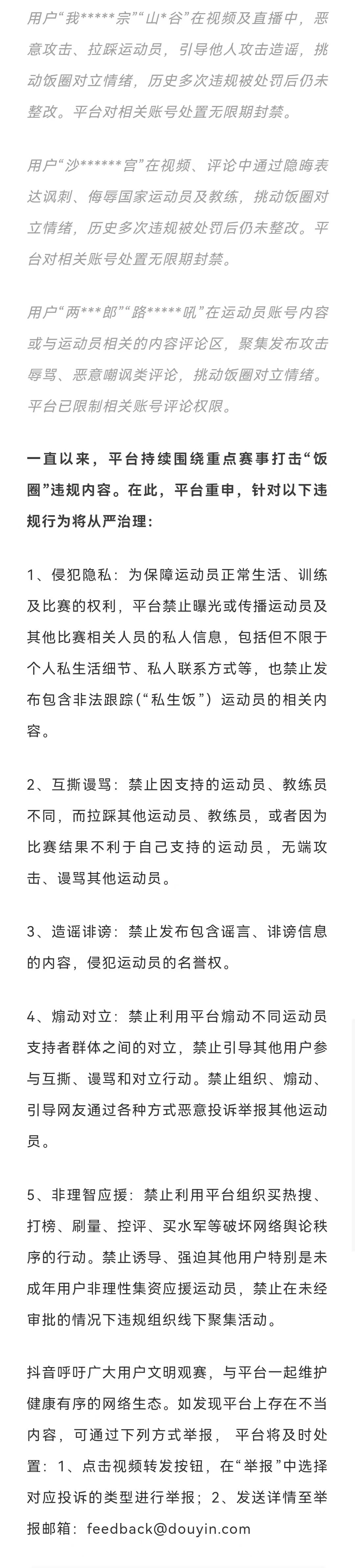 1.抖音公告:这些账号被无限期封禁 近日,抖音官方账号发布《抖音关于全运会期间持续治理“饭圈”违规内容的公告》。近期,第十五届全运会正如火如荼进行,平台发现,少数用户无底线炒作运动员“CP”、拉踩运动员及教练,甚至发布人身攻击内容。对此,抖音已启动专项治理。近一个月以来,平台共计处置涉体育“饭圈”违规视频1.1万条,违规评论33.3万条;对144个违规账号视违规程度采取限制评论权限、禁言、无限期封禁等梯度处罚。现将部分处置案例公告如下↓(“抖音黑板报”微信公众号)
