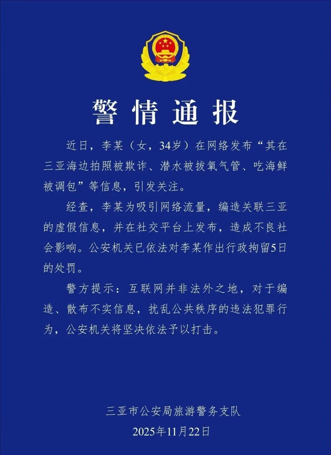 3.在三亚潜水被拔氧气管、吃海鲜被调包?警方通报:11月22日,海南省三亚市公安局旅游警务支队发布警情通报称,近日,李某(女,34岁)在网络发布“其在三亚海边拍照被欺诈、潜水被拔氧气管、吃海鲜被调包”等信息,引发关注。经查,李某为吸引网络流量,编造关联三亚的虚假信息,并在社交平台上发布,造成不良社会影响。公安机关已依法对李某作出行政拘留5日的处罚。(央广网)