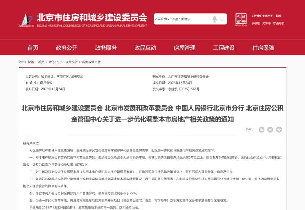 1.条件再放宽!北京出台购房新政:24日,北京市住房城乡建设委等四部门联合印发《关于进一步优化调整本市房地产相关政策的通知》,自2025年12月24日起施行。《通知》明确,为更好满足居民刚性住房需求和多样化改善性住房需求,进一步优化调整住房限购政策。一是放宽非京籍家庭购房条件。二是支持多子女家庭住房需求。(人民网)