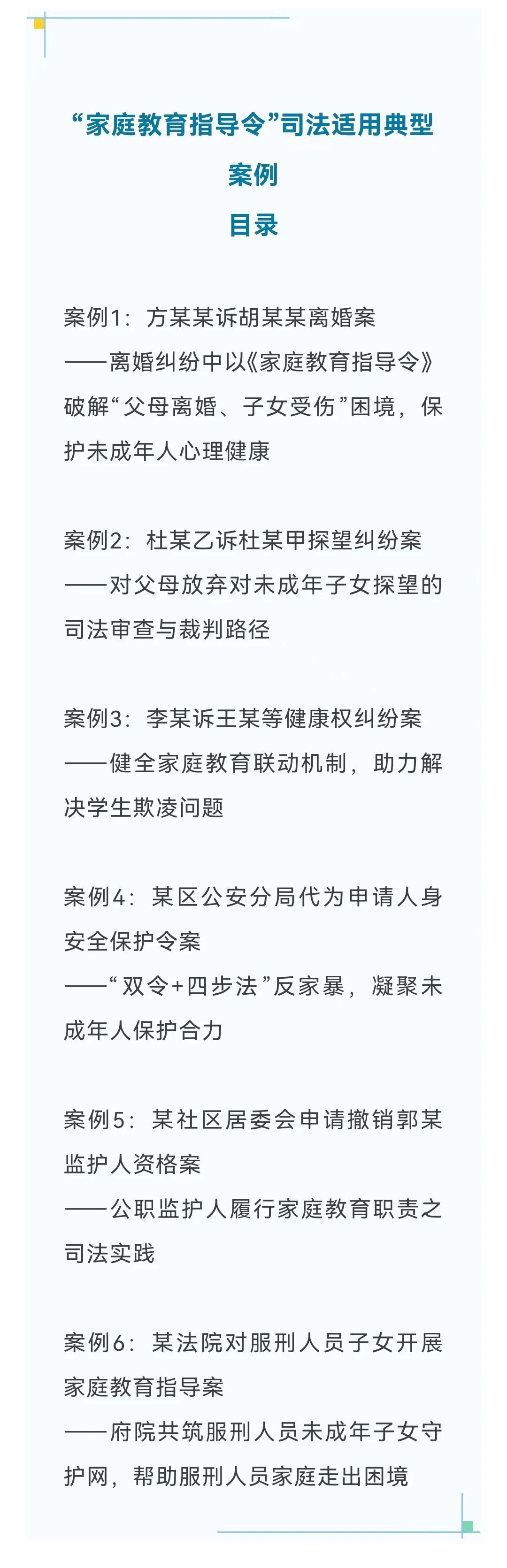 1. 最高人民法院发布“家庭教育指导令”司法适用典型案例:近期,最高人民法院对2022年以来人民法院贯彻落实家庭教育促进法适用“家庭教育指导令”的经验做法进行了梳理总结。近日,公开发布6个“家庭教育指导令”司法适用典型案例。(最高人民法院)