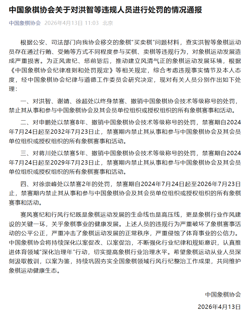 1. 三人参与“买卖棋”被终身禁赛:针对象棋“买卖棋”违规行为,中国象棋协会13日发布对洪智等违规人员进行处罚的情况通报,通报如下↓(央视网、中国象棋协会)