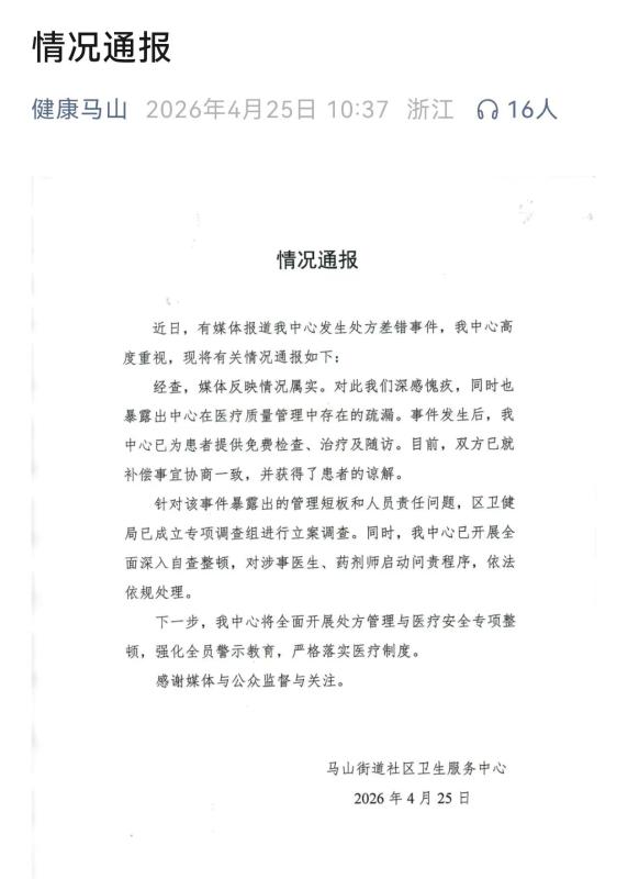 浙江绍兴应大妈因脚部受伤,到街道社区卫生服务中心就医,结果院方开错了一种口服药的剂量,一次2粒变成了一次21粒。当天应大妈分两次共吃了42粒,觉得难受想吐。她回到该卫生中心,经确认该药品应当是每次服用2粒,随即院方给应大妈做了身体检查,血常规结果基本正常,葡萄糖和乳酸脱氢酶两项指标超标。4月25日,浙江绍兴马山街道社区卫生服务中心就“医生将2粒药写成21粒,患者服药后身体不适”一事发布情况通报,全文如下↓(人民日报)